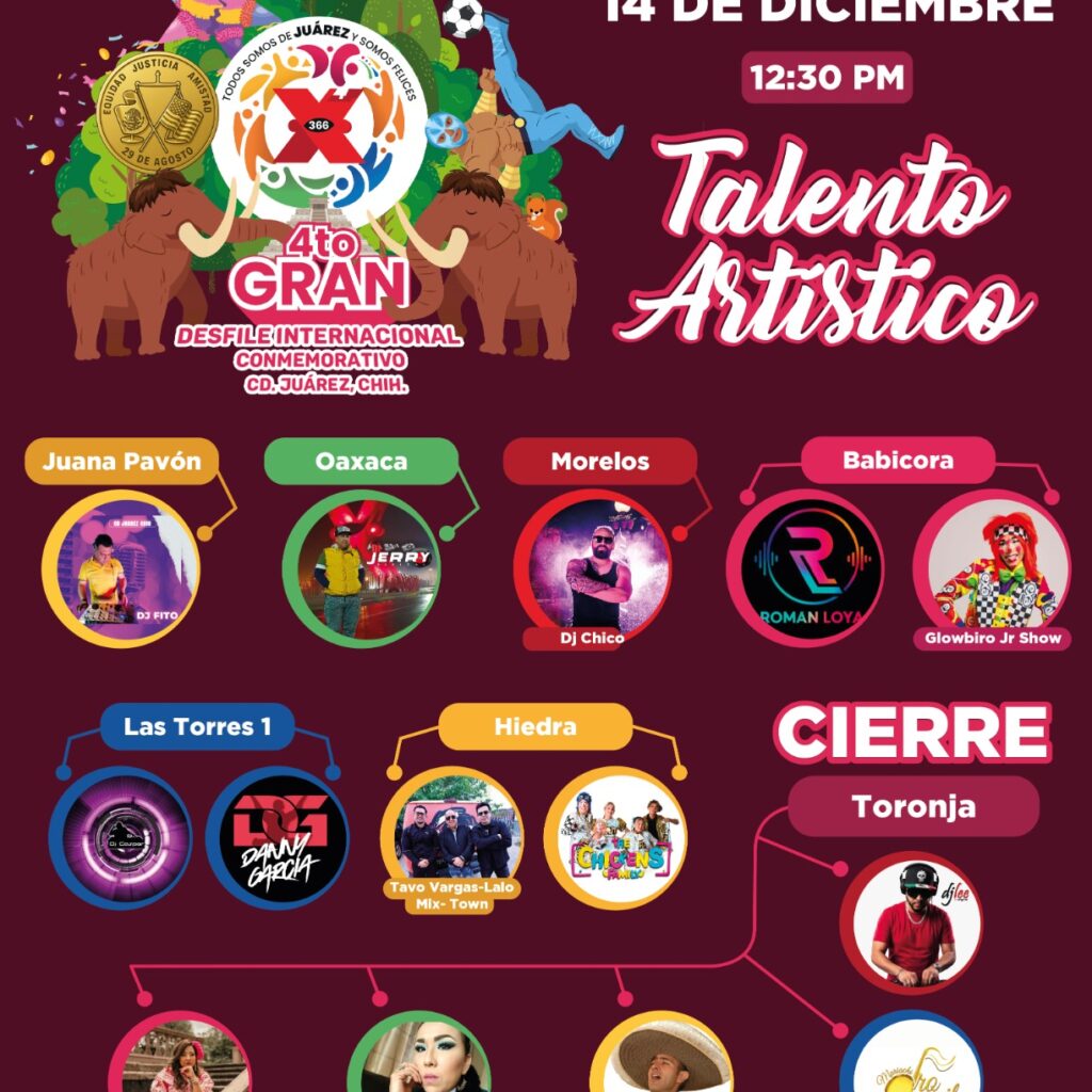 Sábado 6 de Diciembre del 2025.- El próximo domingo 14 de diciembre, las y los fronterizos vivirán por cuarto año consecutivo la experiencia del Gran Desfile Conmemorativo, que esta vez celebra el 366 aniversario de fundación de la ciudad. Es por lo que dentro de las actividades para el disfrute de la ciudadanía, se tienen contempladas las presentaciones de diversos…