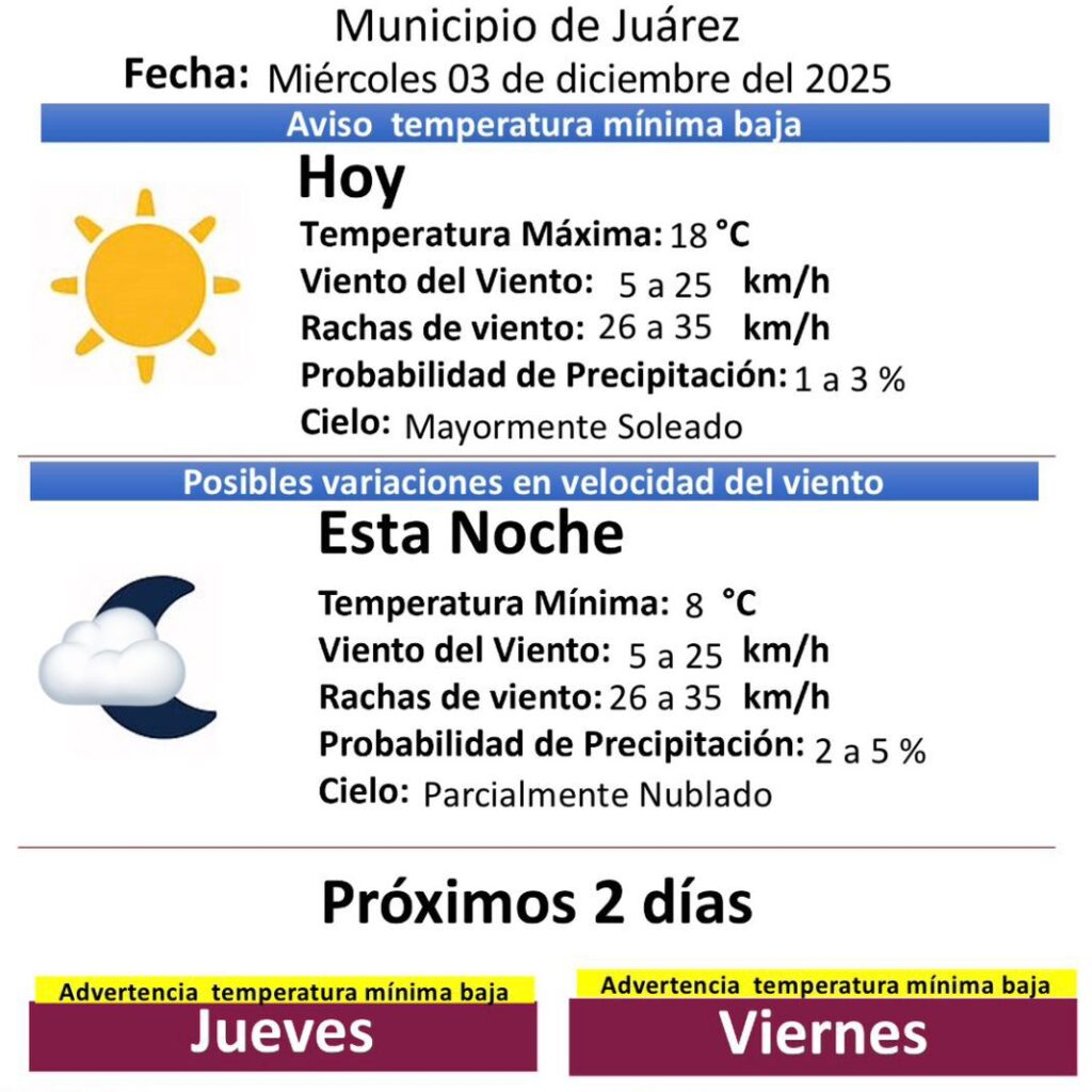 Miércoles 3 de Diciembre del 2025.- La Dirección General de Protección Civil informó que este miércoles 3 de diciembre de 2025 se mantiene un aviso por temperatura mínima baja en Ciudad Juárez, con condiciones frías durante la noche y la madrugada. Para hoy, la temperatura máxima alcanzará los 18 grados centígrados, con vientos que oscilarán entre 5 y 25 kilómetros…