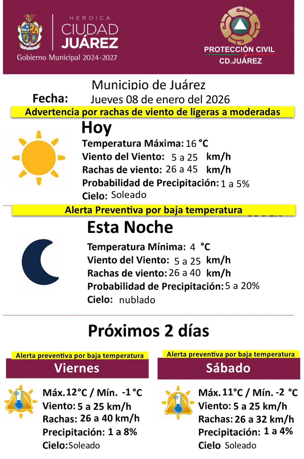 Jueves 8 de Enero del 2026.- La Dirección General de Protección Civil del Municipio emitió un aviso preventivo por condiciones climatológicas para este jueves 8 de enero, ante la presencia de rachas de viento de ligeras a moderadas y el descenso de temperaturas en la región.