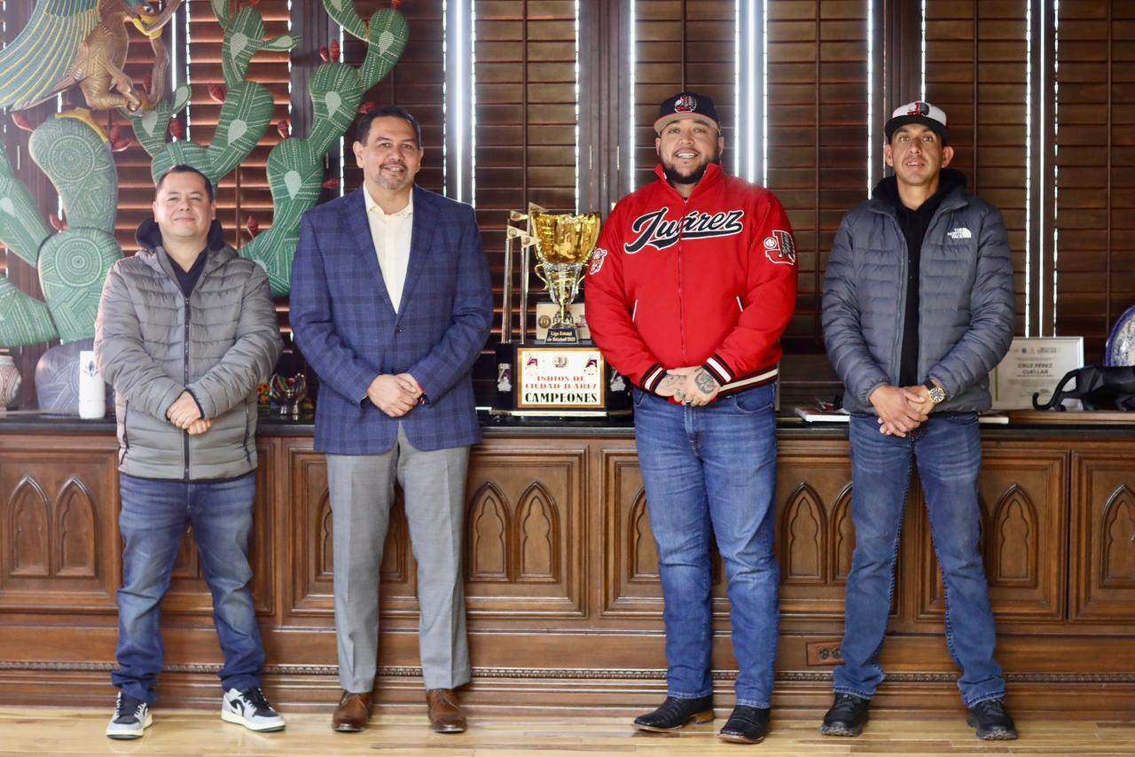 Viernes 9 de Enero del 2026.- El Presidente Municipal, Cruz Pérez Cuéllar recibió en su despacho a integrantes del equipo de beisbol Indios de Juárez, quienes presentaron sus planes rumbo a la temporada 2026 y refrendaron su compromiso de defender el campeonato de la Liga Estatal de Beisbol, luego de una sequía de 25 años.