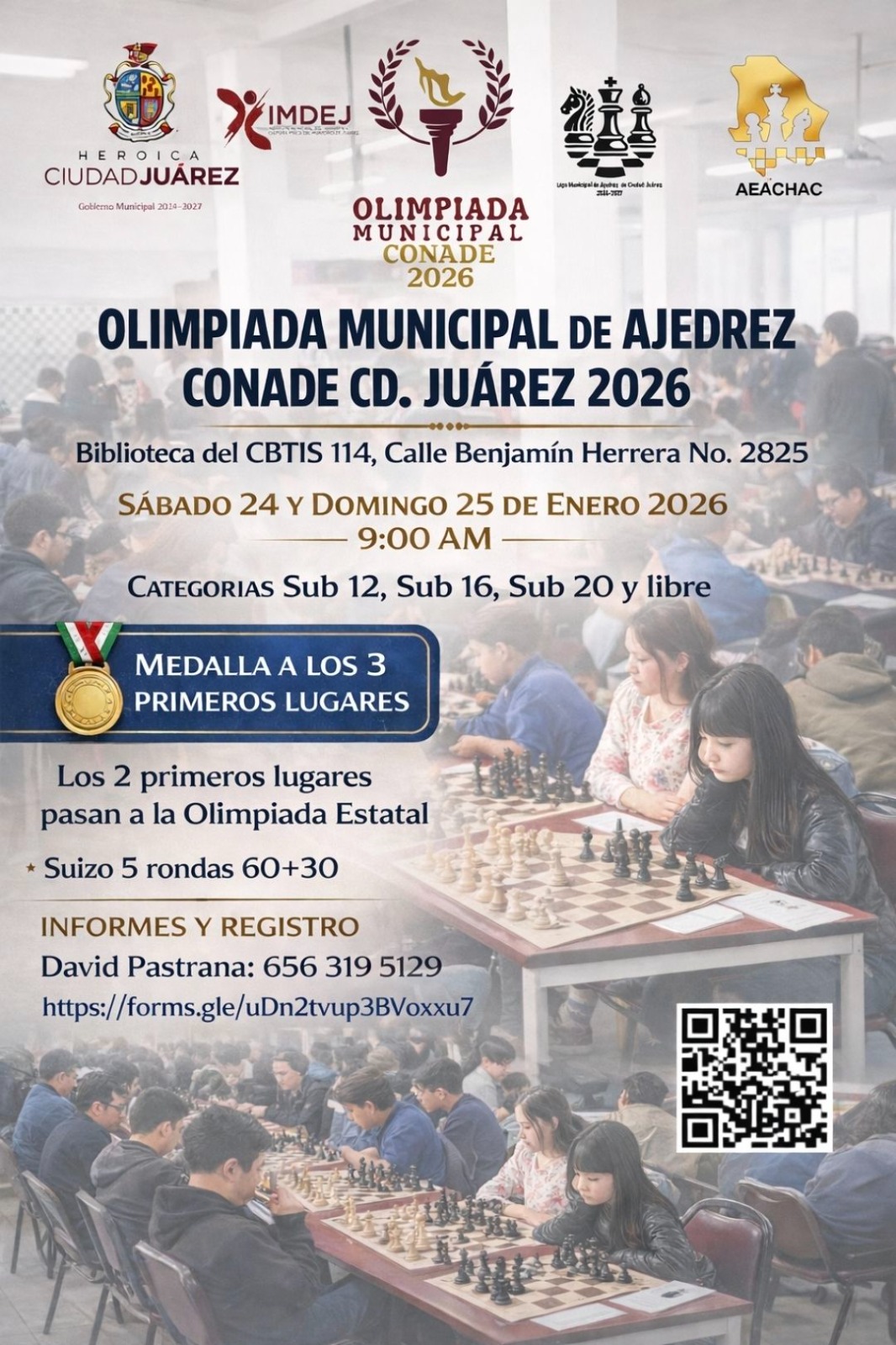 Miércoles 14 de Enero del 2026.- La Liga Municipal de Ajedrez lanzó la convocatoria para la Olimpiada Municipal de Ajedrez que se llevará a cabo el 24 y 25 de enero.