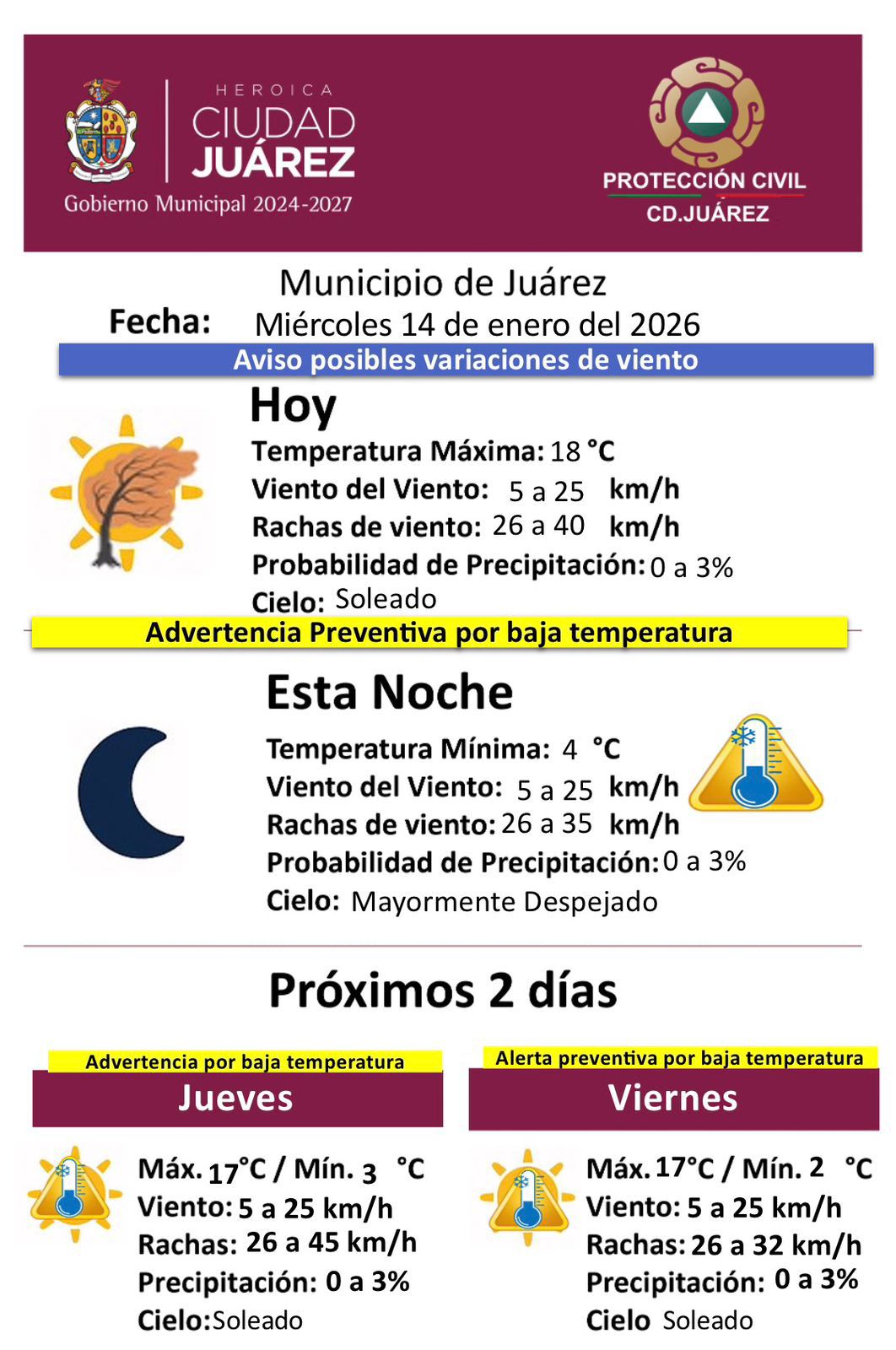 Miércoles 14 de Enero del 2026.- La Dirección General de Protección Civil del Municipio informó que para este miércoles 14 de enero se mantiene un aviso por posibles variaciones de viento, así como advertencia preventiva por baja temperatura en la ciudad.