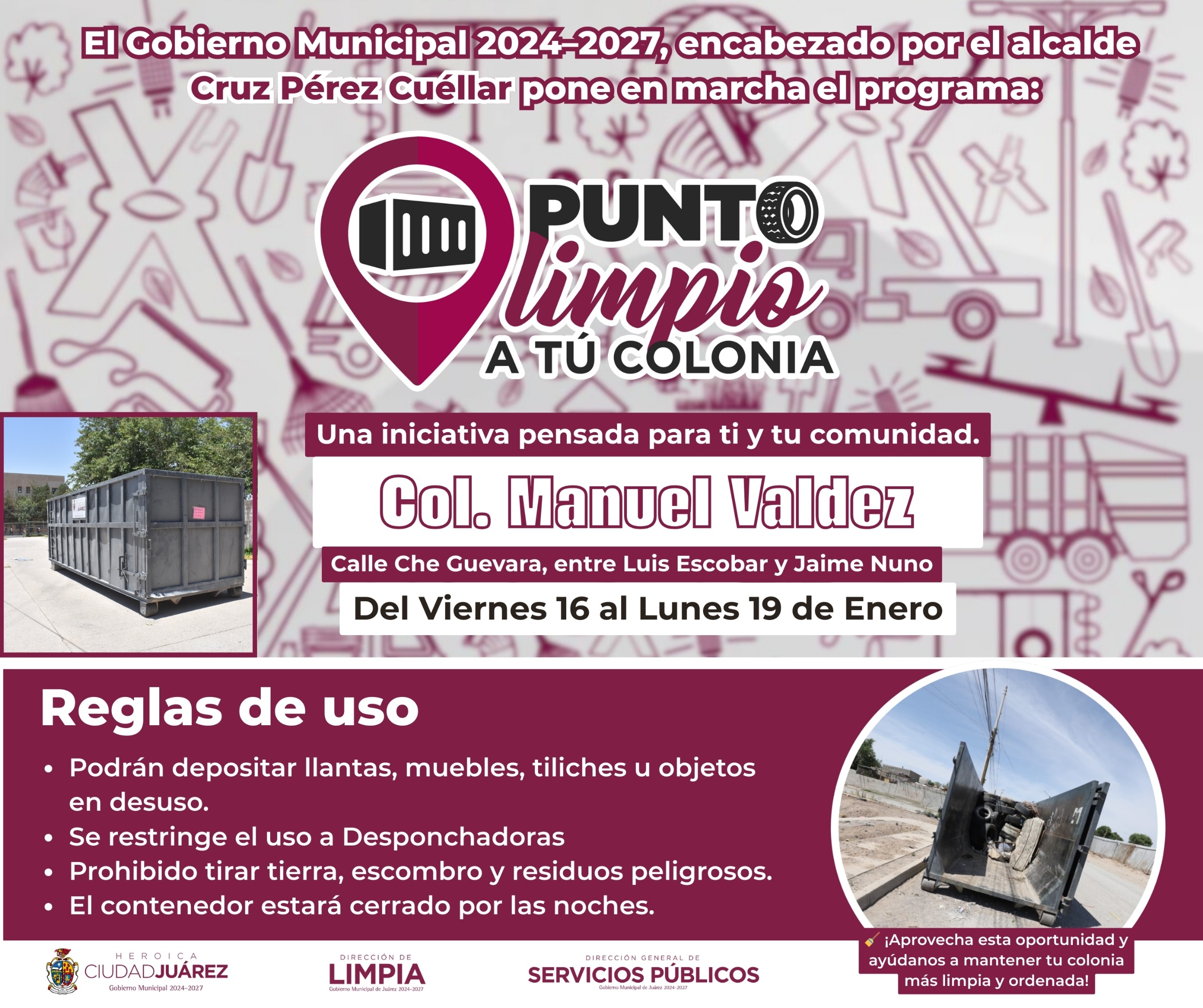 18 de Enero del 2026.- La Dirección General de Servicios Píblicos Minicipales, a través de la Dirección de Limpia, invita a la ciudadanía a aprovechar los contenedores del programa Puntos Limpios a tu Colonia, los cuales se instalaron desde el pasado viernes en distintos sectores de la ciudad.