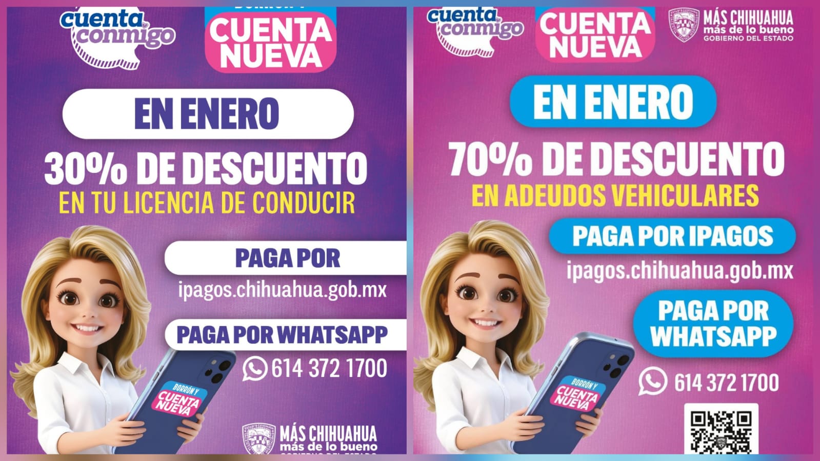 Los pagos pueden realizarse a través de la página ipagos.chihuahua.gob.mx, por WhatsApp al número (614) 372 17 00, o mediante referencia para pago en bancos o tiendas de conveniencia.