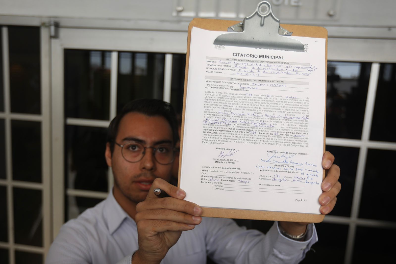 Martes 20 de Enero del 2026.- El Gobierno Municipal llevó a cabo este día la entrega de citatorios municipales por los edificios que albergan a los partidos Acción Nacional y Revolucionario Institucional, como parte del procedimiento legal por los adeudos que presentan en el pago del Impuesto Predial.