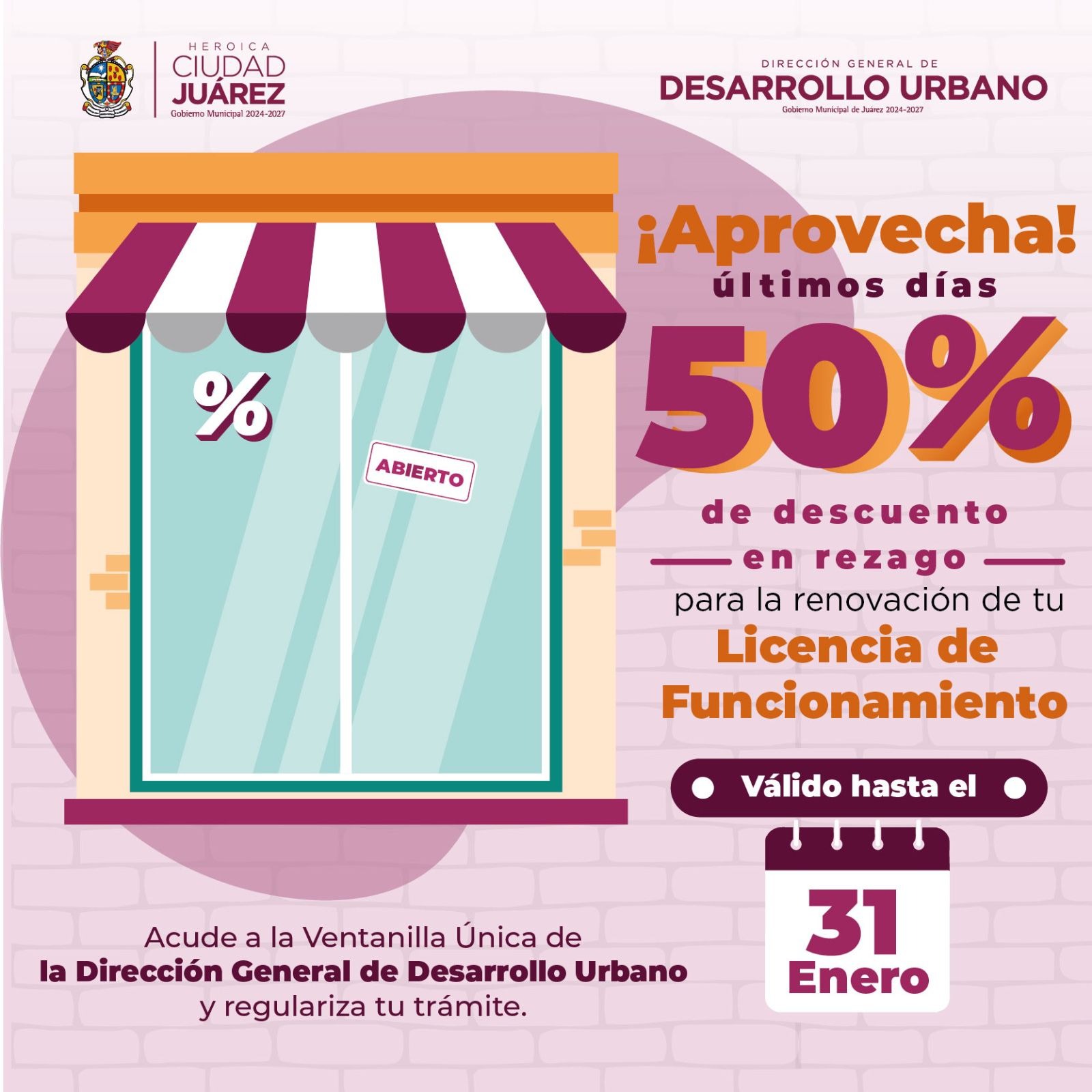 Miércoles 21 de Enero del 2026.- La Dirección General de Desarrollo Urbano da a conocer que el próximo 31 de enero vence el plazo para aprovechar el descuento del 50% en recargos en la renovación de la Licencia de Funcionamiento, beneficio dirigido a comerciantes y empresarios que buscan regularizar su situación durante este inicio de año.