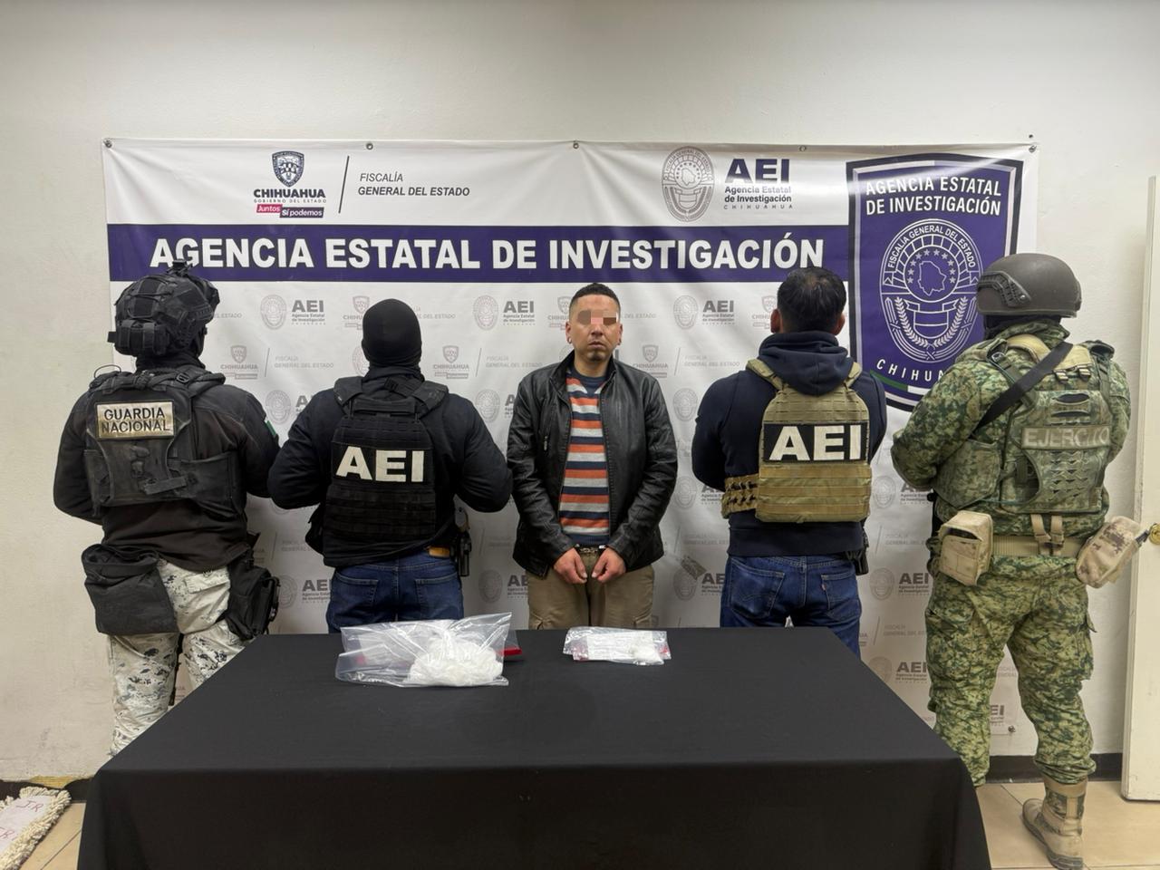 Ciudad Juárez, Chih., a 24 de enero de 2026.- Elementos de la Agencia Estatal de Investigación del Centro de Operaciones Estratégicas de la Fiscalía de Distrito Zona, detuvieron en flagrancia a quien dijo llamarse Héctor Raúl O.Z., por posesión de medio kilo de metanfetamina.