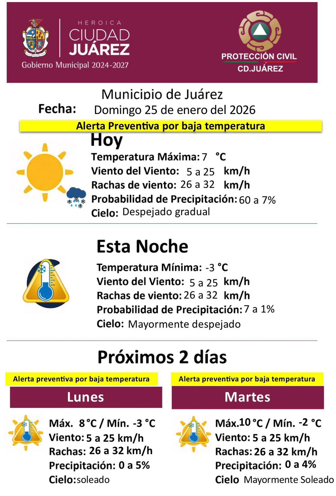 25 de Enero del 2026.- La Dirección General de Protección Civil del Municipio de Juárez informa el pronóstico meteorológico correspondiente al domingo 25 de enero de 2026, el cual se mantiene bajo alerta preventiva por bajas temperaturas.