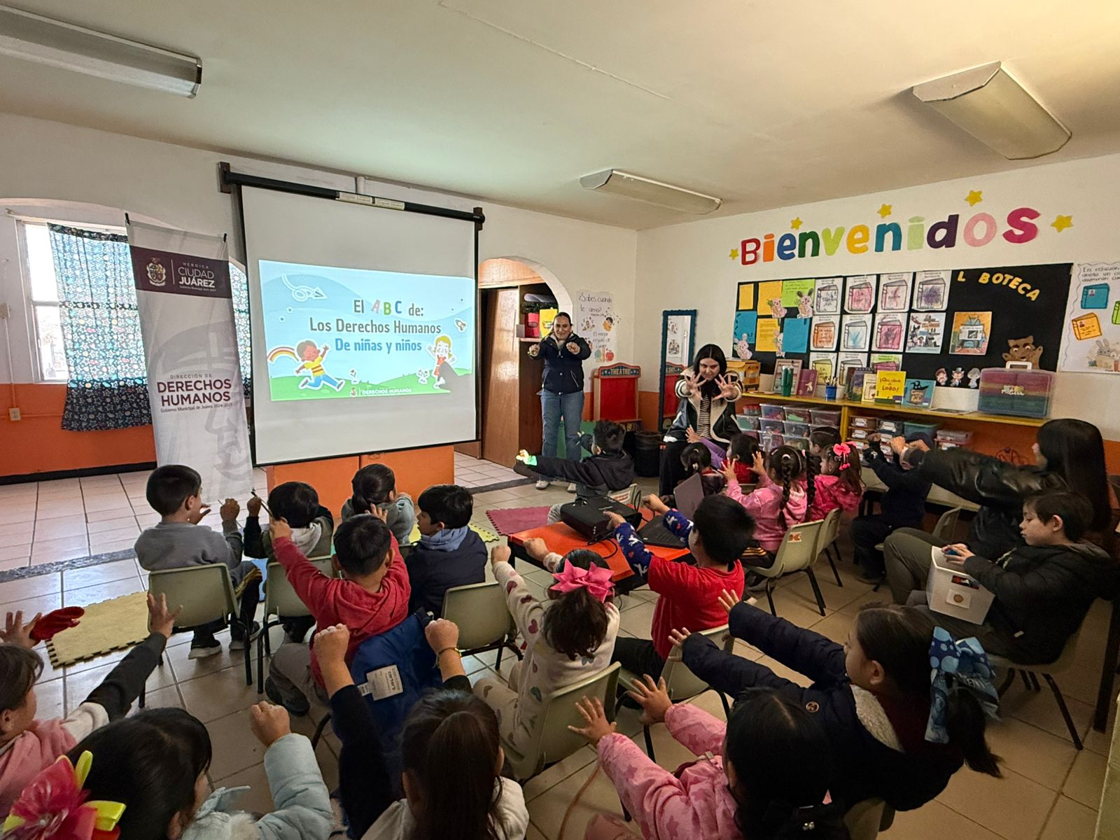 Jueves 29 de Enero del 2026.- La Dirección de Derechos Humanos estuvo presente en el Jardín de Niños 20 de Noviembre, con el objetivo de impartir el taller “El ABC de los Derechos Humanos de Niñas y Niños”, para promover desde la primera infancia el conocimiento y respeto de sus derechos.