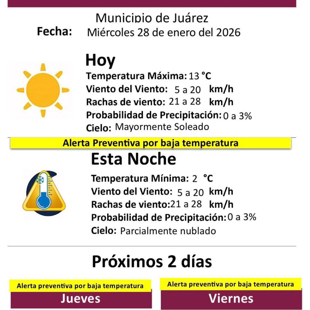 Miércoles 28 de Enero del 2026.- La Dirección General de Protección Civil del Municipio emitió una alerta preventiva por bajas temperaturas para este martes 27 de enero, ante las condiciones climáticas que se registrarán en la ciudad. Para este día se pronostica una temperatura máxima de 11 grados centígrados, con vientos de entre 5 y 20 kilómetros por hora, así…