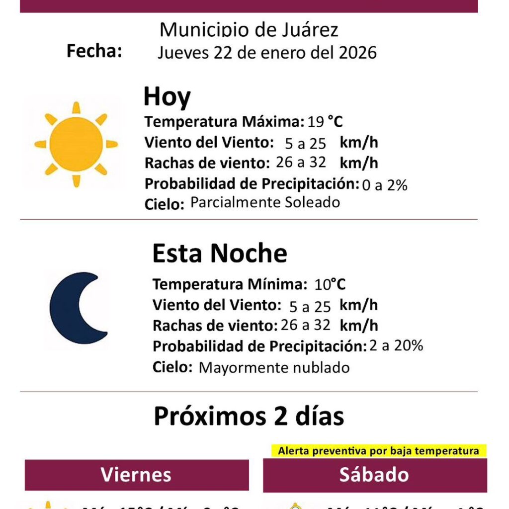 Jueves 22 de Enero del 2026.- La Dirección General de Protección Civil del Municipio de Juárez informó el pronóstico del clima para este jueves 22 de enero de 2026, en el que se prevé un día con condiciones mayormente estables y cielo parcialmente soleado. Durante el transcurso del día, la temperatura máxima alcanzará los 19 grados centígrados, con vientos de…