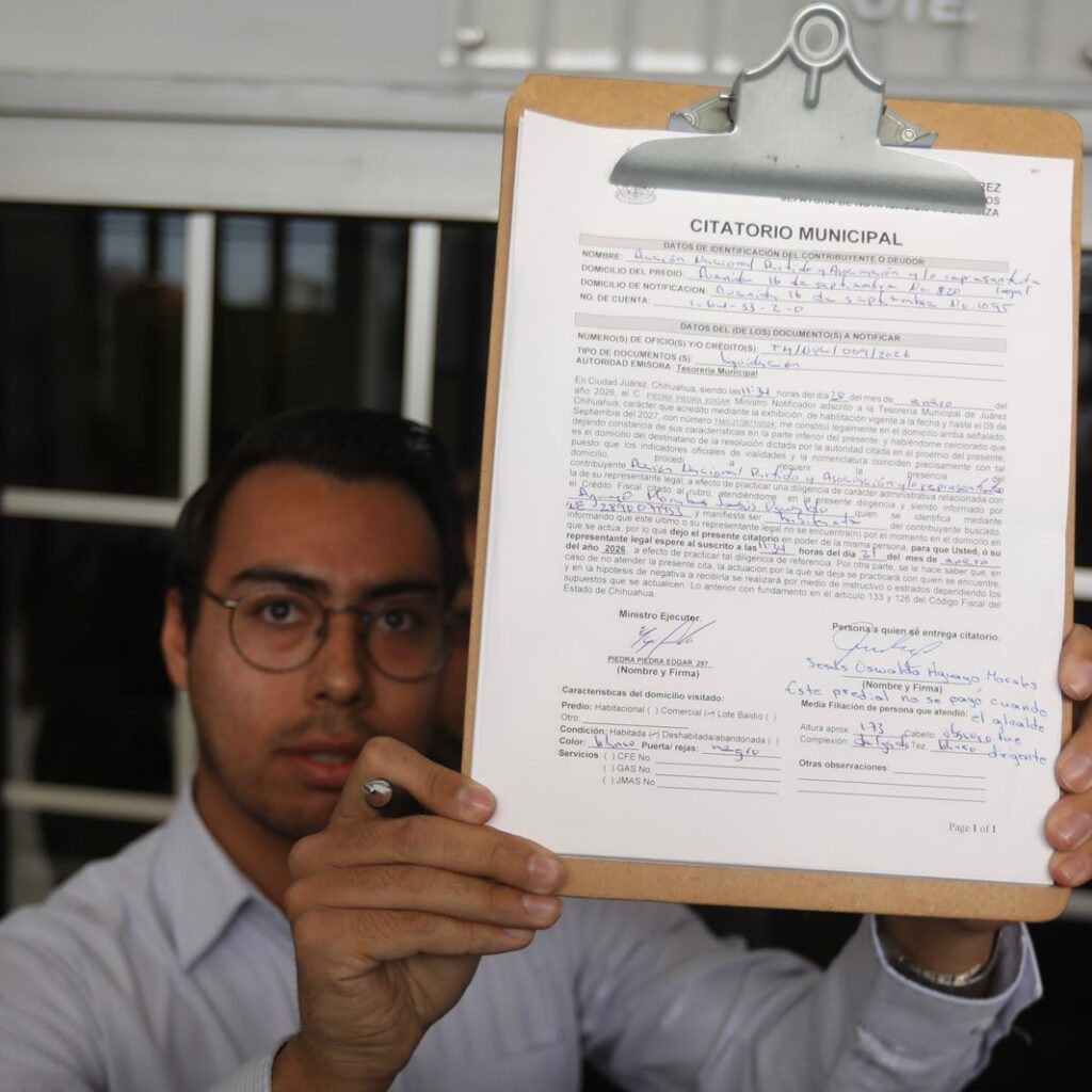 Martes 20 de Enero del 2026.- El Gobierno Municipal llevó a cabo este día la entrega de citatorios municipales por los edificios que albergan a los partidos Acción Nacional y Revolucionario Institucional, como parte del procedimiento legal por los adeudos que presentan en el pago del Impuesto Predial. La diligencia fue encabezada por el secretario del Ayuntamiento, Héctor Rafael Ortiz…