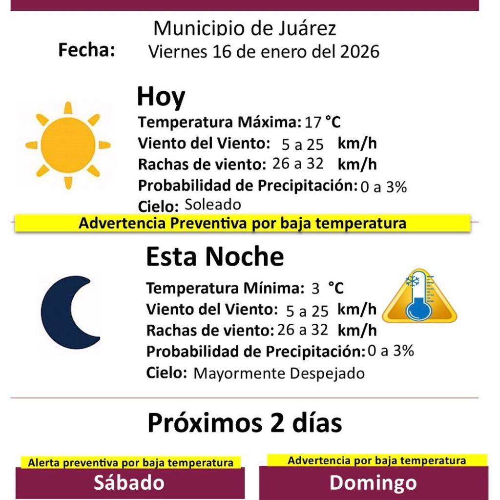 Viernes 16 de Enero del 2026.- La Dirección General de Protección Civil informó que este viernes 16 de enero se mantendrán condiciones mayormente soleadas en el municipio, con advertencia preventiva por baja temperatura, principalmente durante la noche y madrugada. Durante el día se espera una temperatura máxima de 17 grados centígrados, con vientos de 5 a 25 kilómetros por hora…