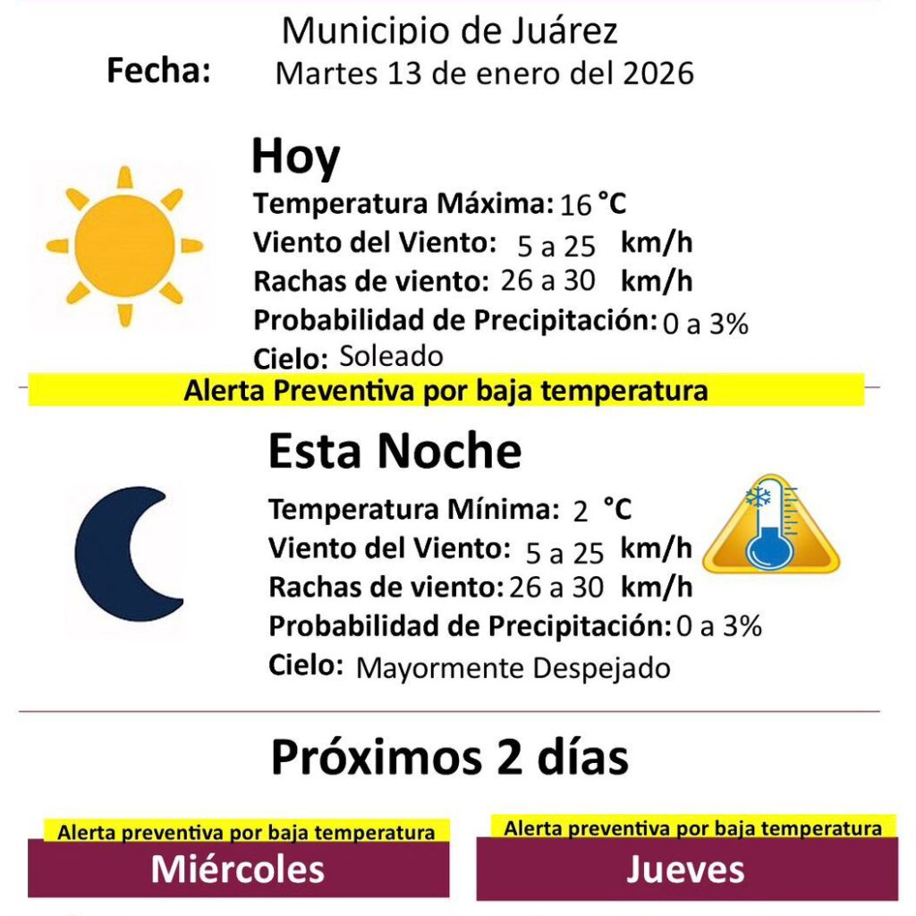Martes 13 de Enero del 2026.- La Dirección General de Protección Civil del Municipio de Juárez informó que para este martes 13 de enero de 2026 se mantiene alerta preventiva por baja temperatura en la ciudad. Durante el día se espera un cielo soleado, con temperatura máxima de 16 grados Centígrados, vientos de 5 a 25 kilómetros por hora y…
