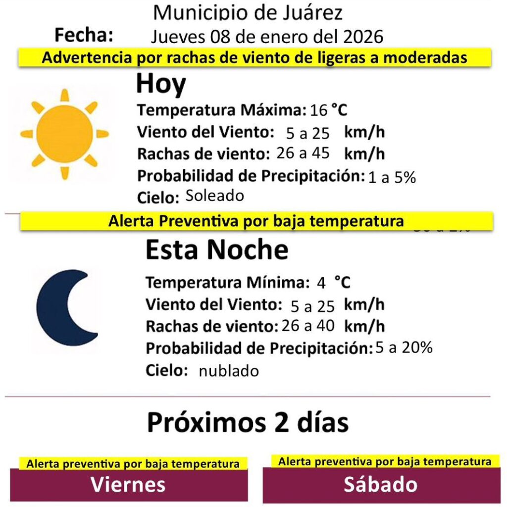 Jueves 8 de Enero del 2026.- La Dirección General de Protección Civil del Municipio emitió un aviso preventivo por condiciones climatológicas para este jueves 8 de enero, ante la presencia de rachas de viento de ligeras a moderadas y el descenso de temperaturas en la región. De acuerdo con el reporte, para hoy se espera una temperatura máxima de 16…