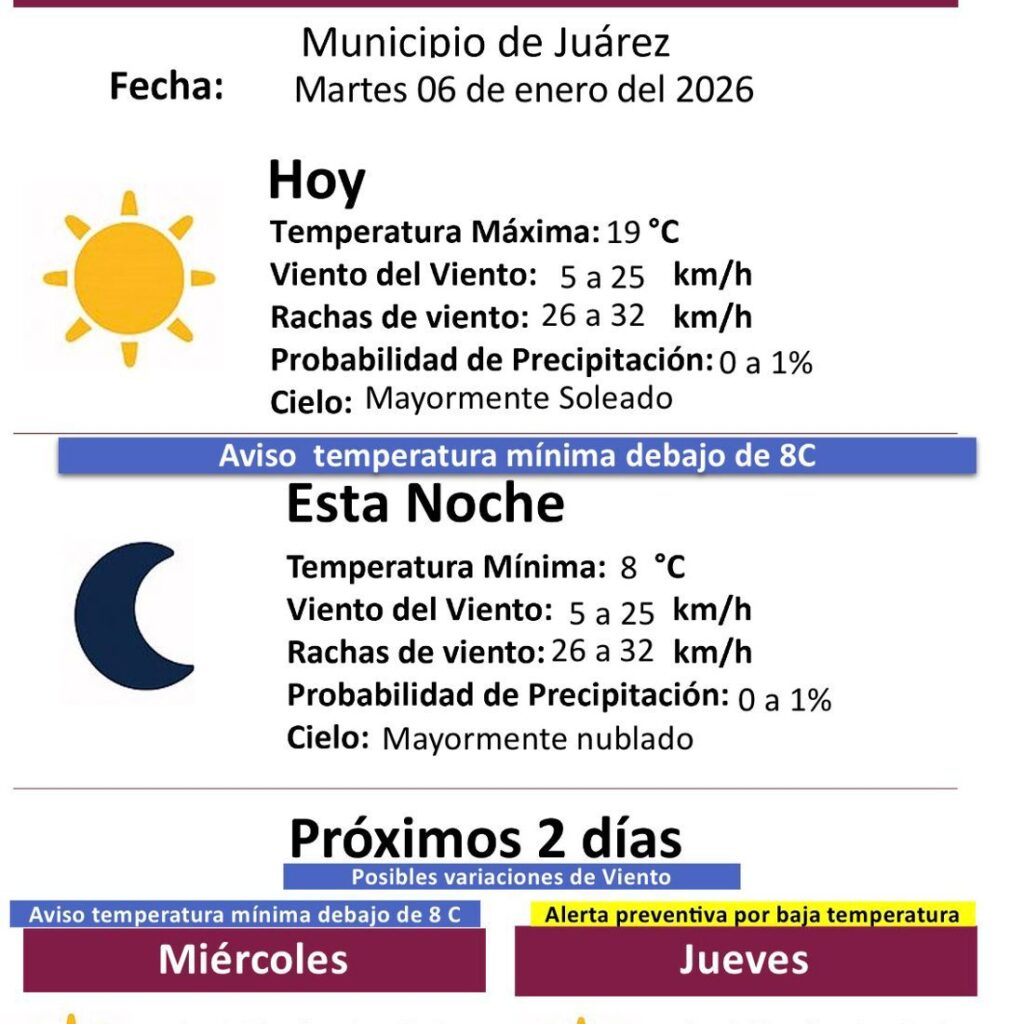 Martes 6 de Enero del 2026.- Este martes 6 de enero, el Municipio de Juárez registra condiciones climáticas mayormente estables, de acuerdo con el reporte emitido por la Dirección General de Protección Civil. Para este día se prevé una temperatura máxima de 19 grados centígrados, con cielo mayormente soleado, vientos de 5 a 25 kilómetros por hora y rachas que…