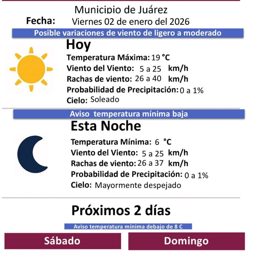 Jueves 2 de Enero del 2025.- La Dirección General de Protección Civil del Municipio de Juárez informó el pronóstico meteorológico para este viernes 2 de enero de 2026, en el que se prevén condiciones mayormente estables, aunque con aviso por temperaturas mínimas bajas durante la noche y madrugada. Para este día se espera una temperatura máxima de 19 grados centígrados,…