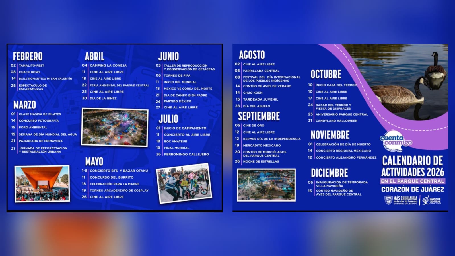 El Gobierno del Estado de Chihuahua presentó el calendario de actividades 2026 del Parque Central de Ciudad Juárez, con una programación que contempla más de 60 eventos a realizarse a lo largo del año.