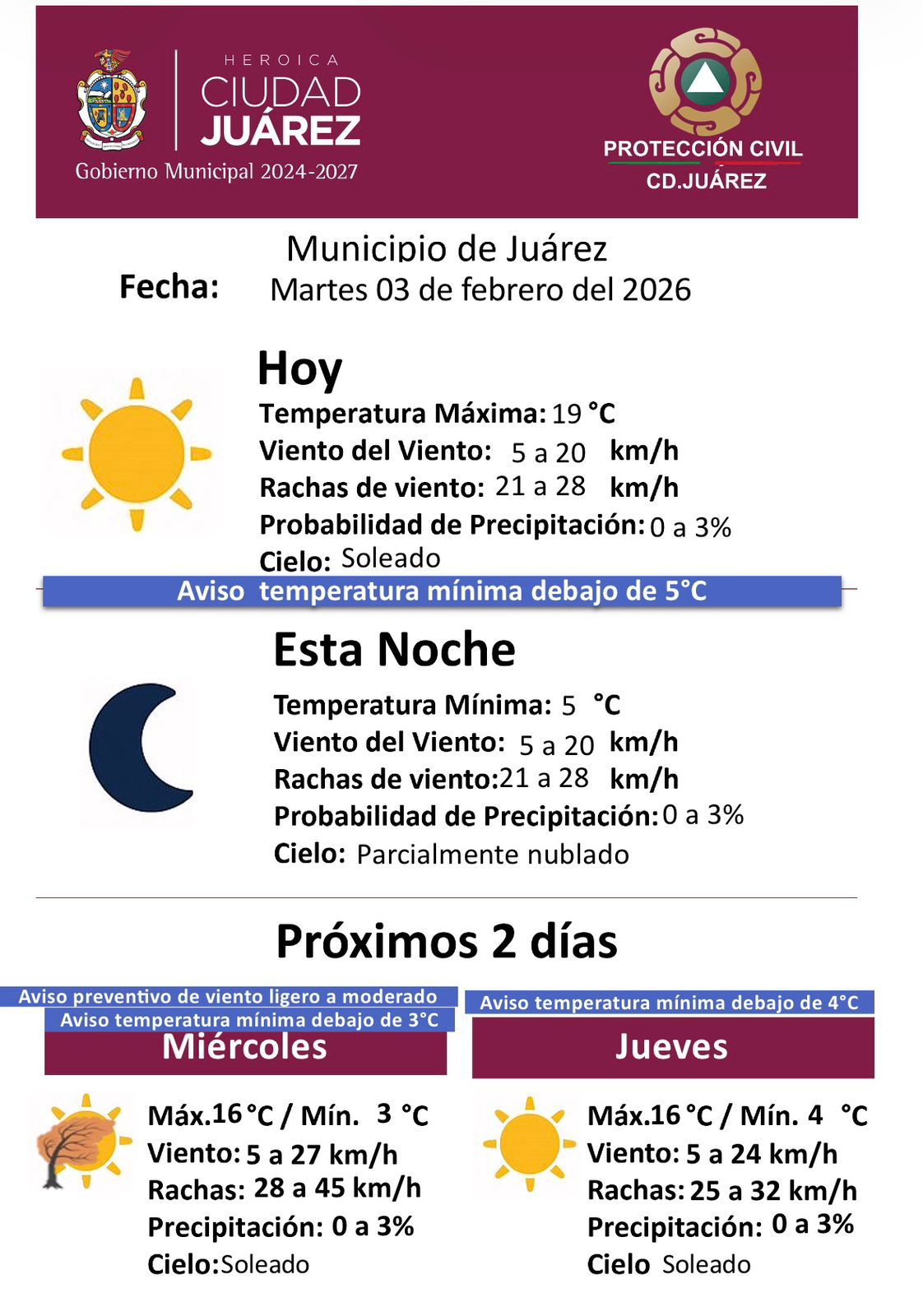 Martes 3 de Febrero del 2026.- La Dirección General de Protección Civil del Municipio informó el pronóstico del clima para este martes 3 de febrero de 2026, en el que se esperan condiciones mayormente estables, con cielo despejado y temperaturas templadas durante el día, así como un descenso térmico durante la noche.