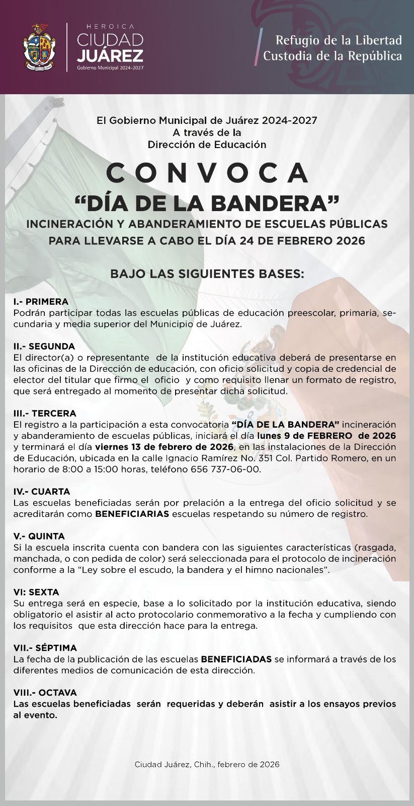 Viernes 6 de Febrero del 2026.- El Gobierno Municipal de Juárez, a través de la Dirección de Educación, emitió la convocatoria para la incineración y abanderamiento de escuelas públicas en el marco de la conmemoración del Día de la Bandera, actividad que se llevará a cabo el 24 de febrero de 2026.