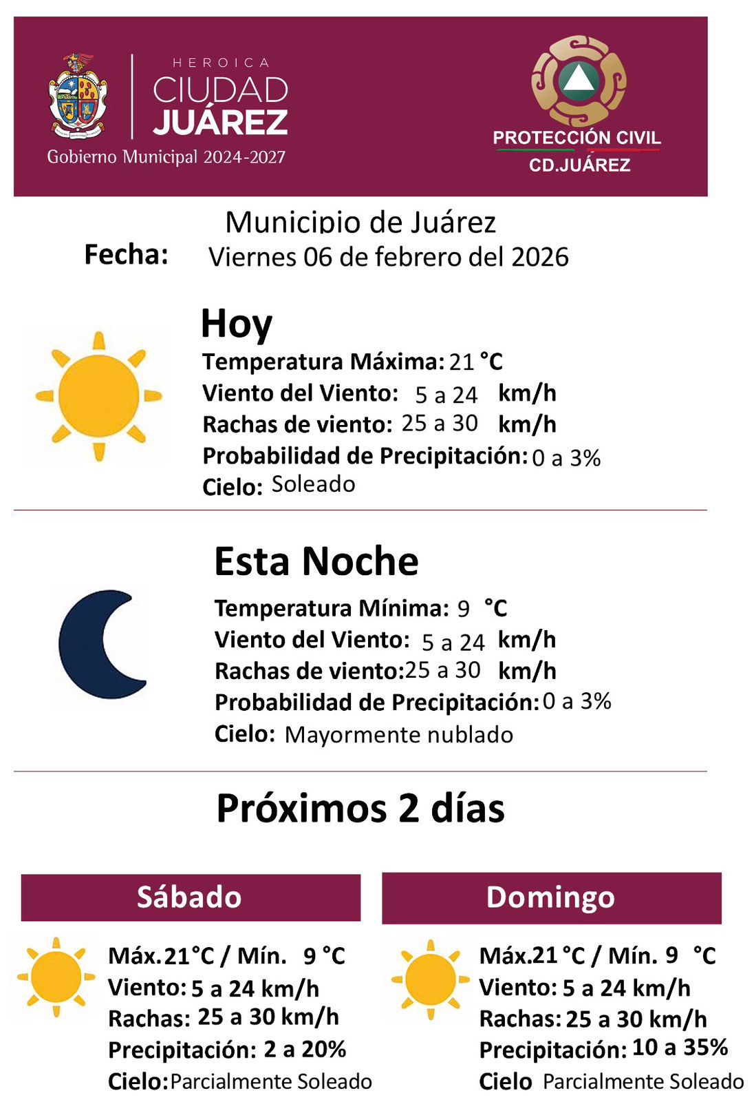 Viernes 6 de Febrero del 2026.- La Dirección de Protección Civil del Municipio informó las condiciones meteorológicas previstas para este viernes 06 de febrero, así como el pronóstico para los próximos días.