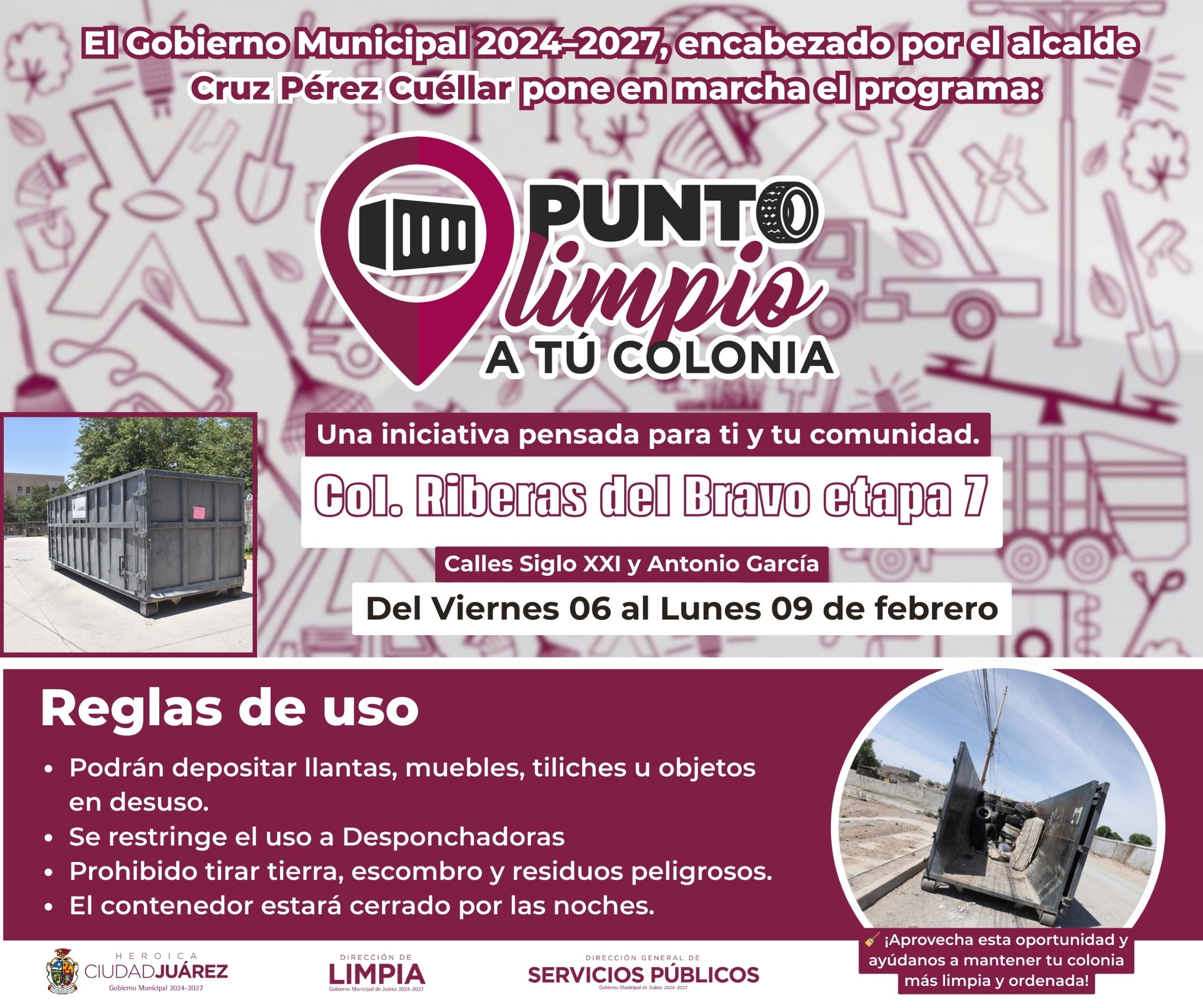 Sábado 7 de Febrero del 2026.- La Dirección General de Servicios Públicos Municipales, a través de la Dirección de Limpia, instaló desde el viernes 6 y hasta el lunes 9 de febrero, cuatro Puntos Limpios a tu Colonia.