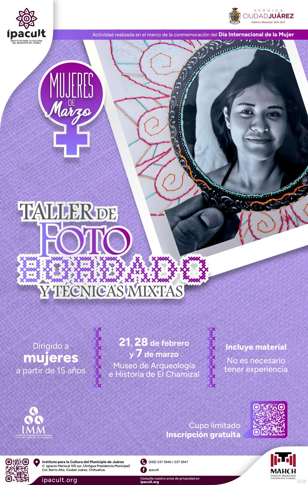 8 de Febrero del 2026.- El Instituto para la Cultura del Municipio de Juárez (IPACULT) invita a mujeres a partir de los 15 años a participar en el taller Mujeres de Marzo: Fotobordado y Técnicas Mixtas, una propuesta formativa que vincula la creación artística con procesos de reflexión personal y colectiva, en el marco de la conmemoración del Día Internacional de la Mujer.