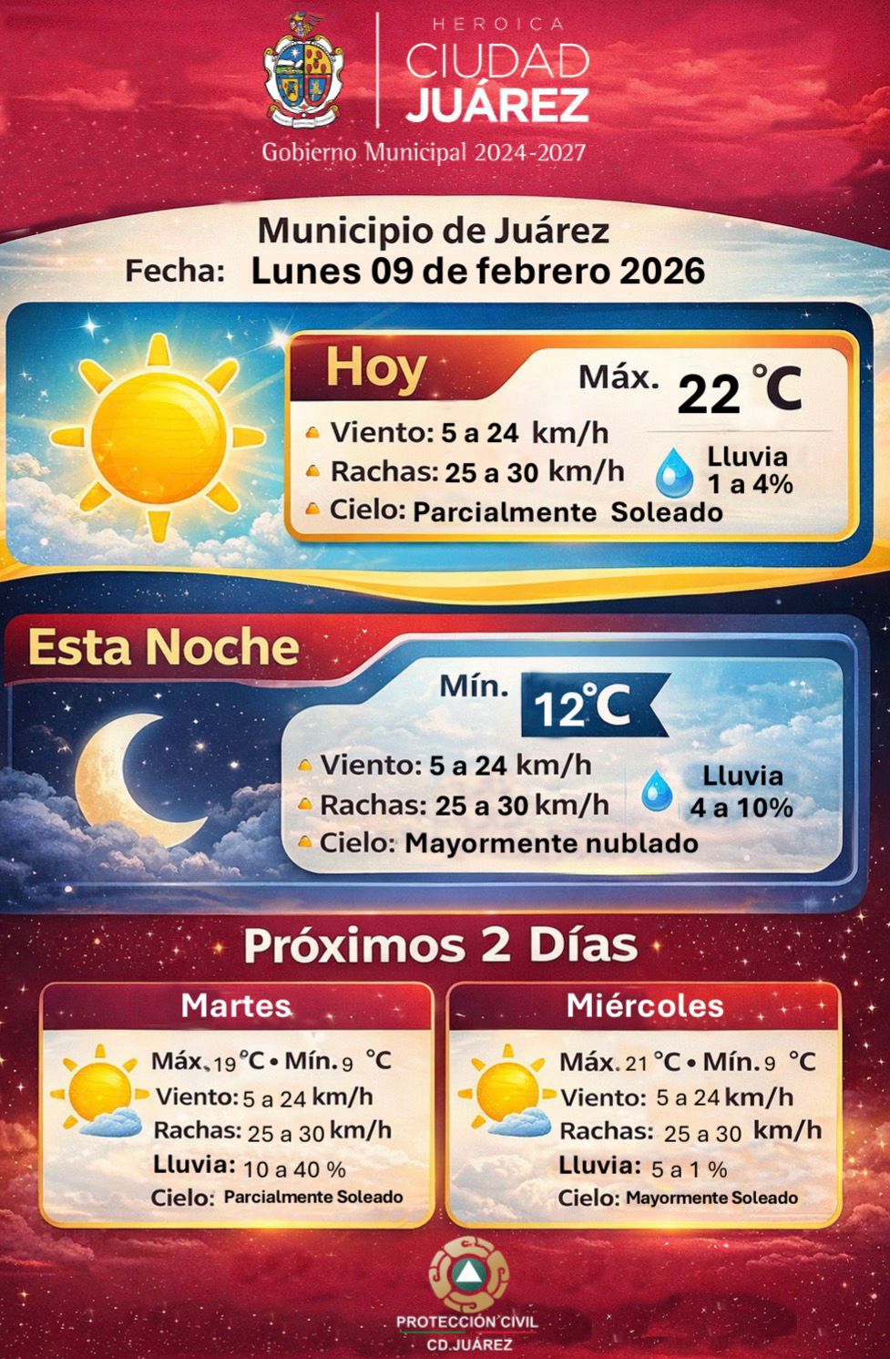 Lunes 9 de Febrero del 2026.- La Dirección de Protección Civil del Gobierno Municipal informó el pronóstico meteorológico para este lunes 9 de febrero, en el que se prevé un clima mayormente estable con temperaturas templadas durante el día.