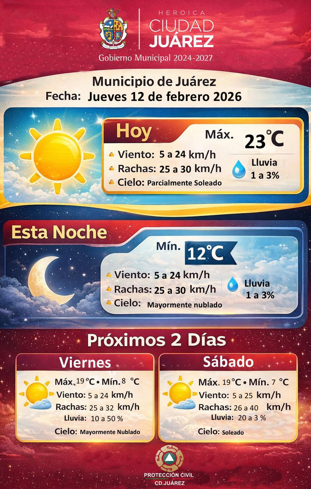 Jueves 12 de Febrero del 2026.- La Dirección General de Protección Civil del Municipio dio a conocer el pronóstico del clima para este jueves 12 de febrero, en el que se prevé una temperatura máxima de 23 grados centígrados y condiciones de cielo parcialmente soleado.