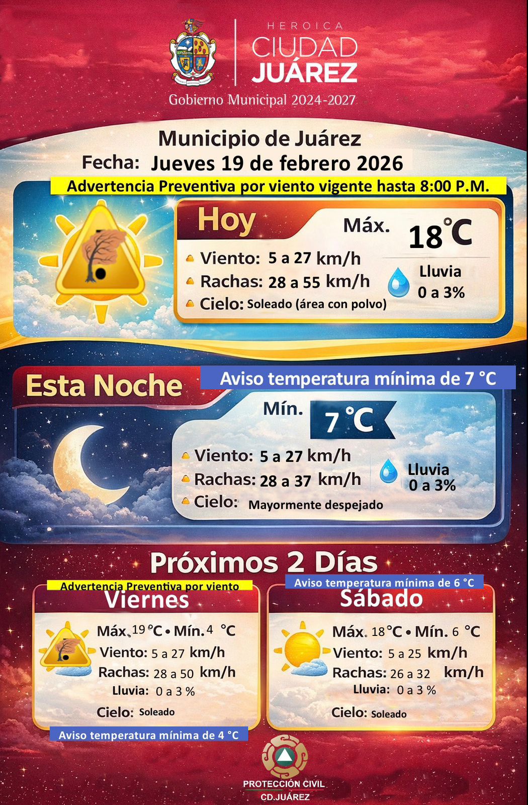 Jueves 19 de Febrero del 2026.- La Dirección General de Protección Civil del Gobierno Municipal, informó que este jueves 19 de febrero se mantiene una advertencia preventiva por viento vigente hasta las 8:00 de la noche.