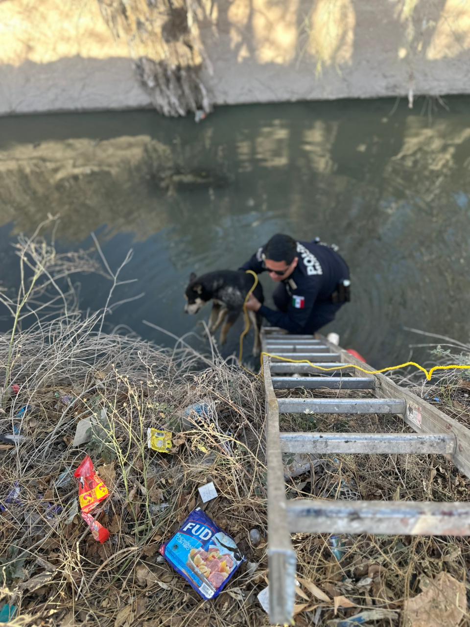 De manera inmediata, los oficiales acudieron al lugar señalado, en donde se entrevistaron con una ciudadana quien manifestó que al pasar por el canal ubicado en dicho cruce observó a un perro de color negro en el interior, intentando salir por sus propios medios.