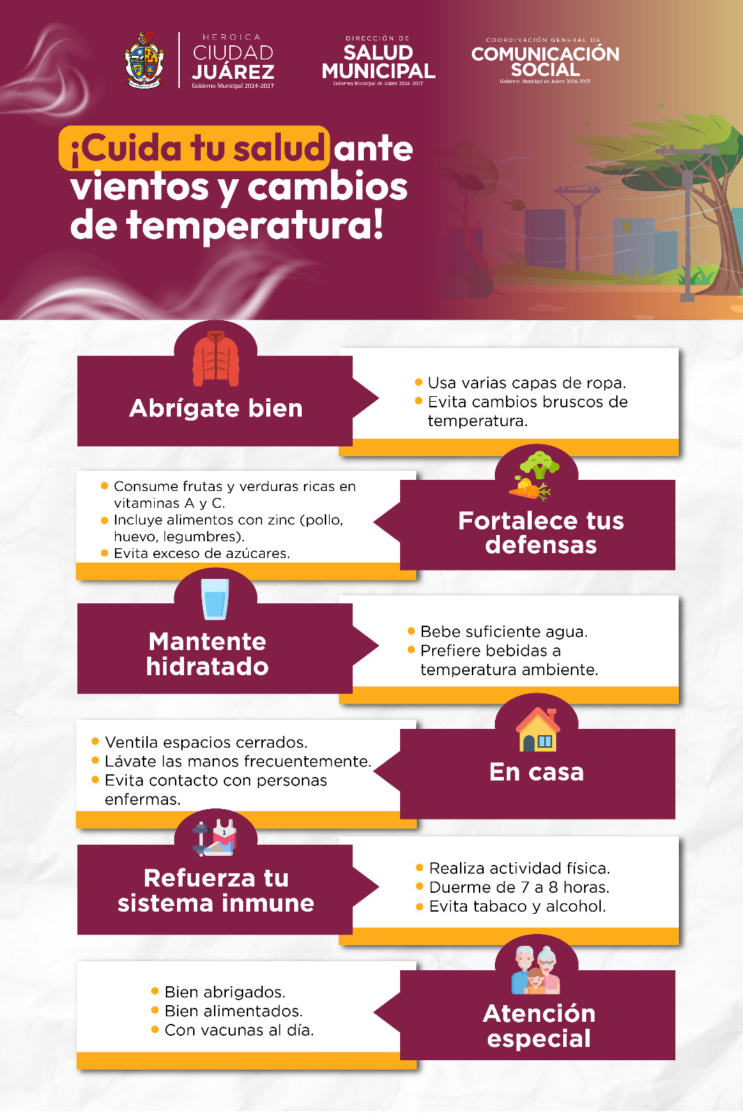 Salud Municipal emite recomendaciones por fuertes vientos y cambios de temperatura