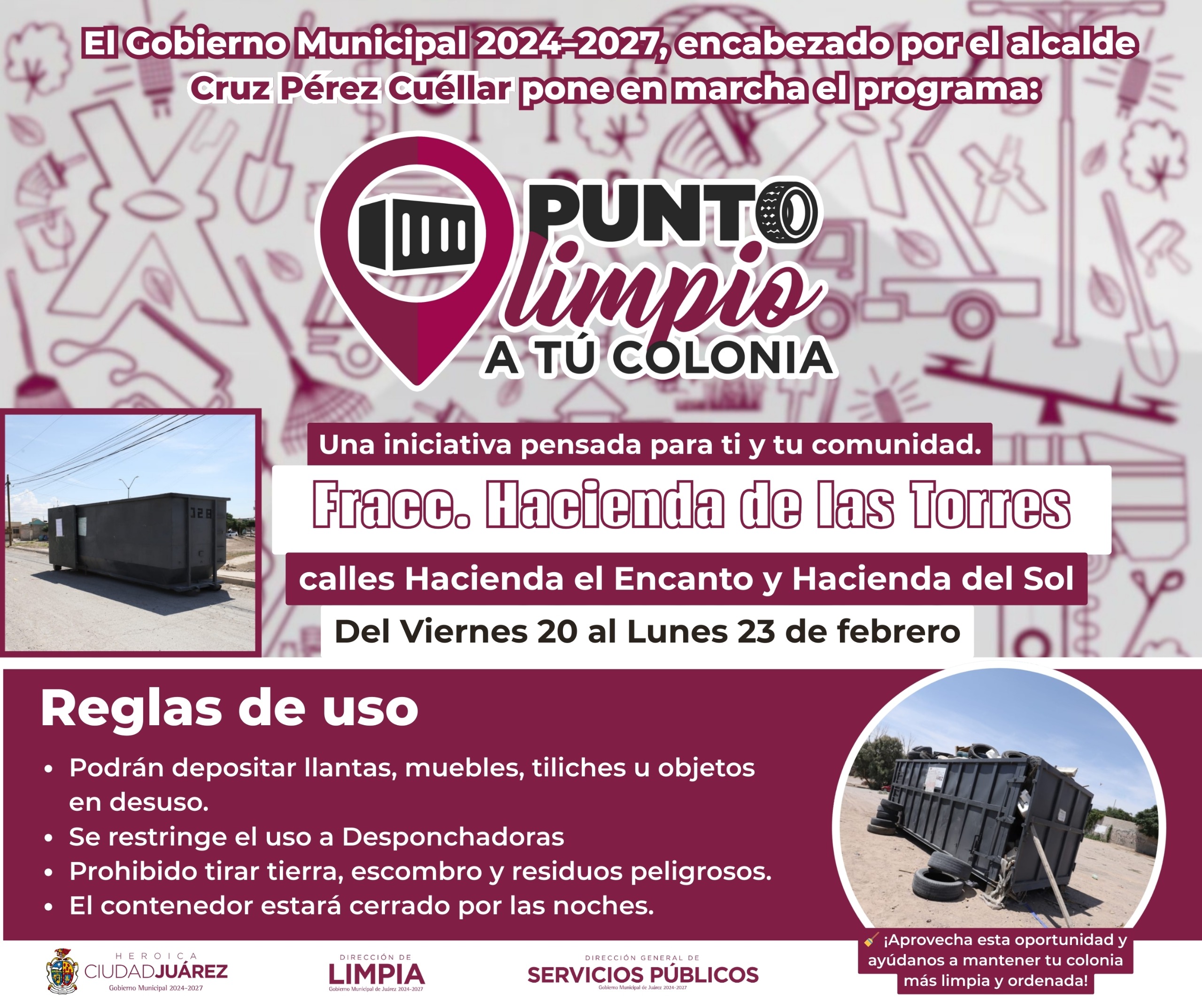 Sábado 21 de Febrero del 2026.- La Dirección de Limpia instaló desde ayer y hasta el lunes 23 de febrero, “Puntos Limpios a tu Colonia”, con el objetivo de acercar a los vecinos espacios adecuados para la disposición de tiliches y residuos de gran volumen.