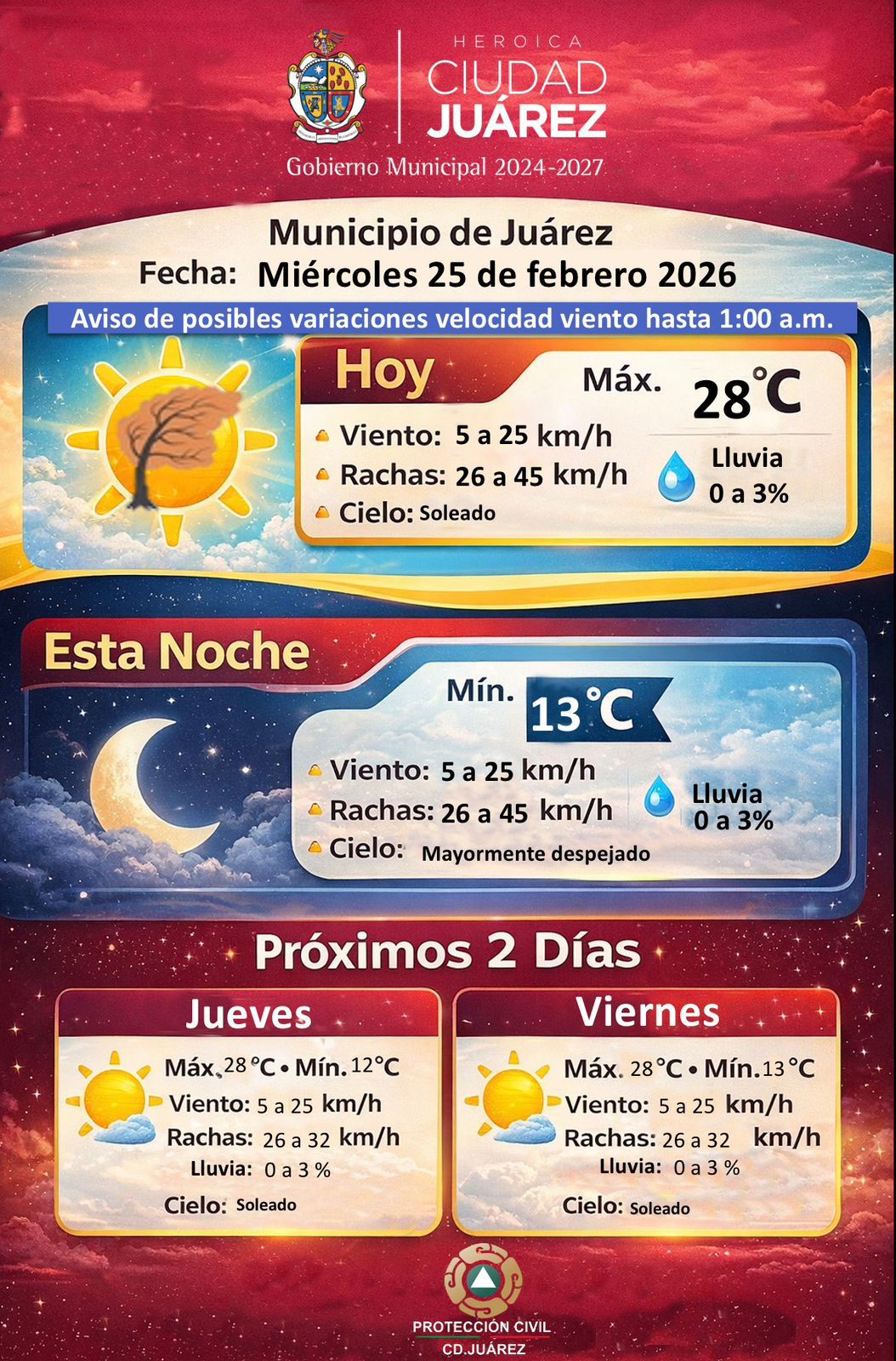 Miércoles 25 de Febrero del 2026.- La Dirección General de Protección Civil del Gobierno Municipal, informó que para este miércoles 25 de febrero se prevé un día soleado, con temperatura máxima de 28 grados Celsius y probabilidad de lluvia mínima, entre 0 y 3 por ciento.