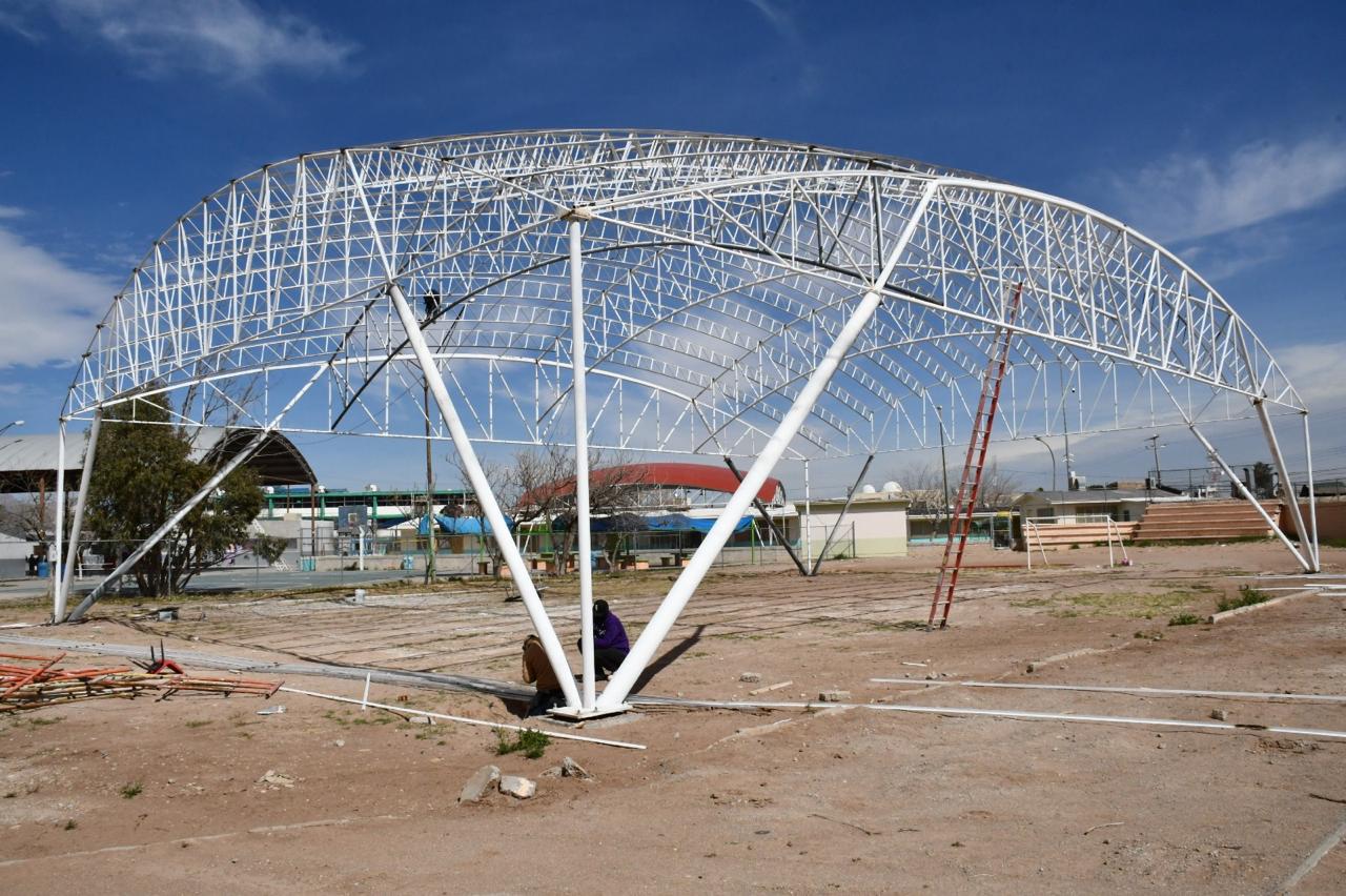 Daniel González García, titular de la dependencia, comentó que los trabajos presentan un avance del 30%, pues la estructura del domo ya está levantando y se tiene pendiente la colocación de láminas que brindarán la sombra a un campo del plantel.
