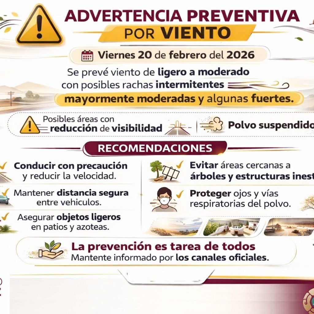 Viernes 20 de Febrero del 2026.- El Gobierno Municipal, a través de la Dirección General de Protección Civil, informó que este viernes 20 de febrero de 2026 se mantiene vigente una advertencia preventiva por viento hasta las 9:00 de la noche. De acuerdo con el pronóstico, para hoy se espera una temperatura máxima de 19 grados Celsius, con viento sostenido…