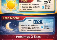 Protección Civil señaló que durante este día continuarán presentándose ráfagas de viento que podrían alcanzar velocidades entre los 50 y 60 kilómetros por hora, mientras que la probabilidad de lluvia se ha reducido a aproximadamente un 5 por ciento.