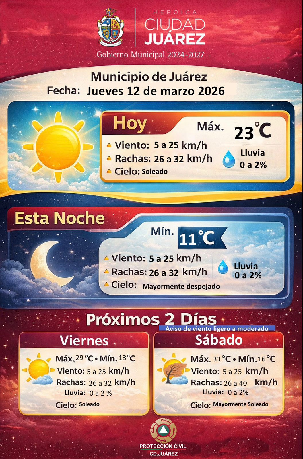 Jueves 12 de Marzo del 2026.- La Dirección General de Protección Civil del Municipio informó que para este jueves 12 de marzo se espera un día mayormente soleado en Ciudad Juárez, con una temperatura máxima de 23 grados centígrados.