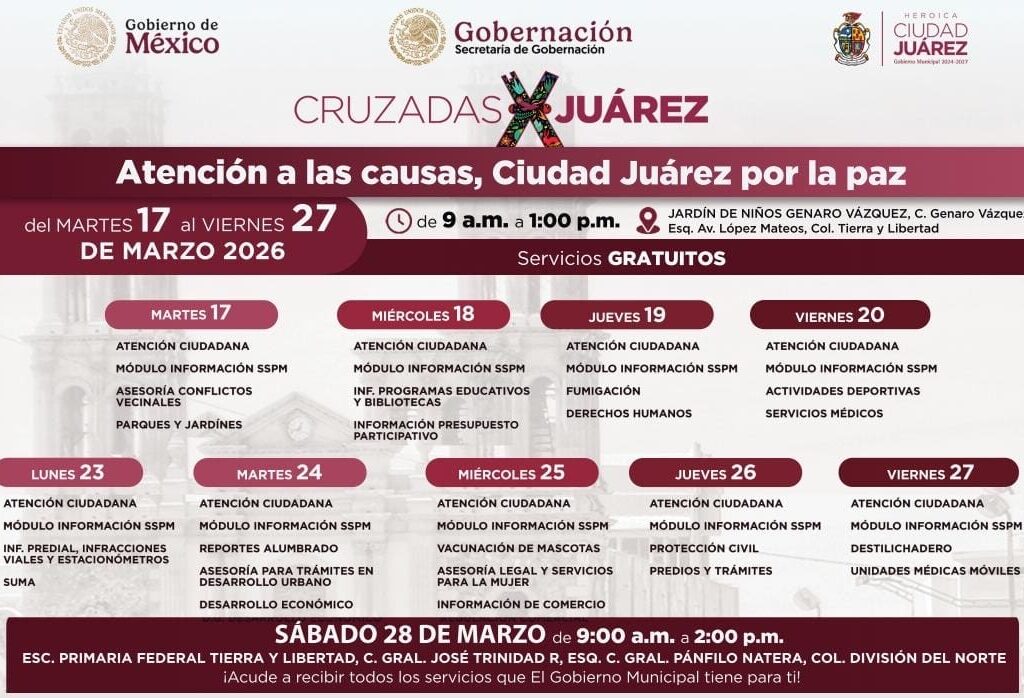 Martes 17 de Marzo del 2026.- Este próximo sábado 28 de marzo se va a llevar a cabo la Cruzada por Juárez, Atención a las Causas, Ciudad Juárez por la Paz en la colonia División del Norte, en la escuela Primaria Federal Tierra y Libertad, ubicada en la calle General José Trinidad R., esquina con calle General Pánfilo Natera de…