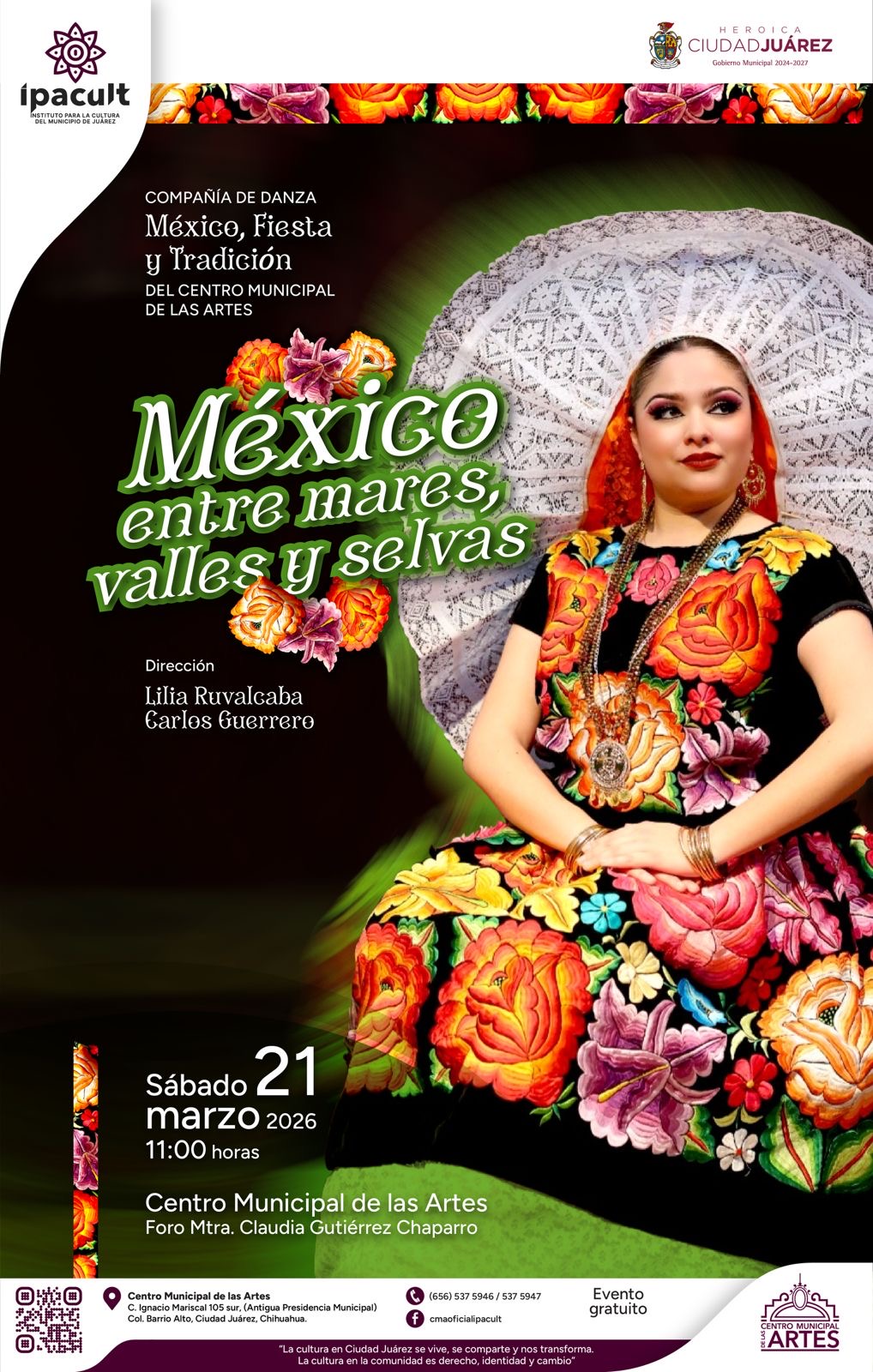 Jueves 19 de Marzo del 2026.- El Instituto para la Cultura del Municipio de Juárez (IPACULT) invita a la comunidad a disfrutar del espectáculo dancístico “México, entre mares, valles y selvas”, a cargo de la Compañía de Danza del Centro Municipal de las Artes (CMA), una propuesta escénica que celebra la riqueza cultural y la diversidad de las tradiciones mexicanas.