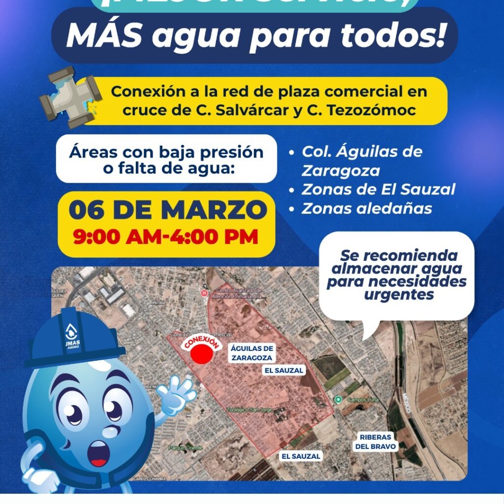 Este viernes 6 de marzo, la Junta de Agua y Saneamiento de Juárez conectará una Plaza Comercial a la red general, por lo que se suspenderá el servicio, en varias colonias cercanas al Sauzal. Los trabajos se realizarán de las 9 de la mañana a las 4 de la tarde, en el cruce de las calles Salvárcar y Tezozomoc, por…