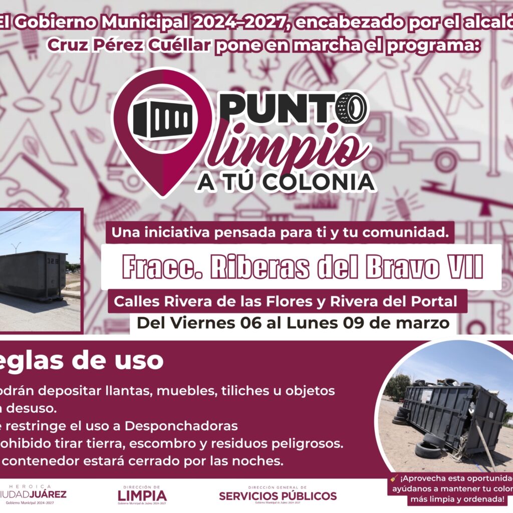 Sábado 7 de Marzo del 2026.- Los Puntos Limpios a tu Colonia, ya se encuentran instalados en distintos sectores de la ciudad, con el objetivo de facilitarle a los juarenses la disposición adecuada de residuos voluminosos. Gobran Solís Kanahan, titular de la Dirección de Limpia, explicó que los contenedores fueron colocados desde ayer en las calles Tepetate y Obsidiana, de…