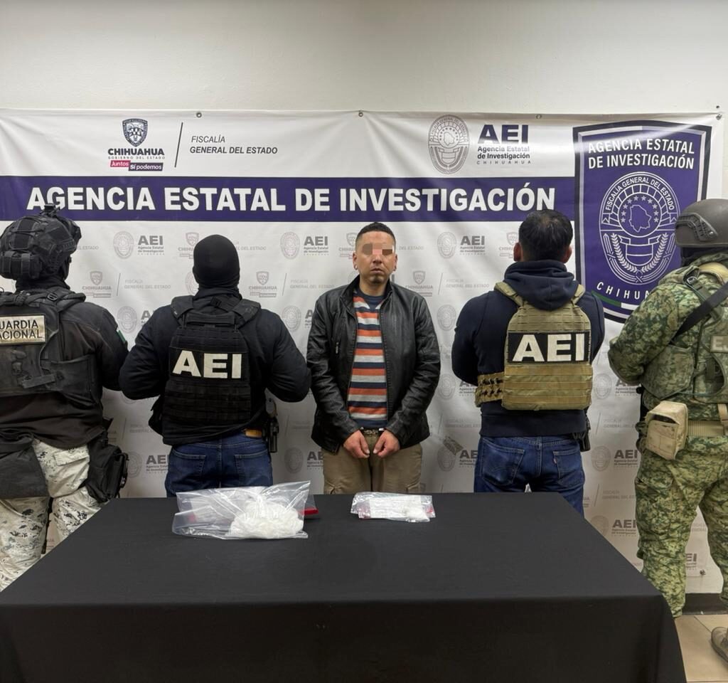 Ciudad Juárez, Chih., a 24 de enero de 2026.- Elementos de la Agencia Estatal de Investigación del Centro de Operaciones Estratégicas de la Fiscalía de Distrito Zona, detuvieron en flagrancia a quien dijo llamarse Héctor Raúl O.Z., por posesión de medio kilo de metanfetamina. Resultado de los operativos coordinados con elementos de la Guardia Nacional y del Ejército Mexicano, se…