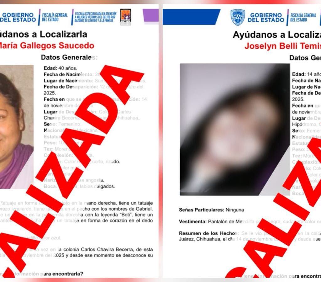 Ciudad Juárez, Chih., a 18 de noviembre de 2025.- La Fiscalía Especializada en Atención a Mujeres Víctimas del Delito por Razones de Género y a la Familia en la Zona Norte, localizó sanas y salvas a una mujer adulta y a una adolescente que contaban con reporte de ausencia, interpuestos por sus familiares el 14 de noviembre de 2025, en…