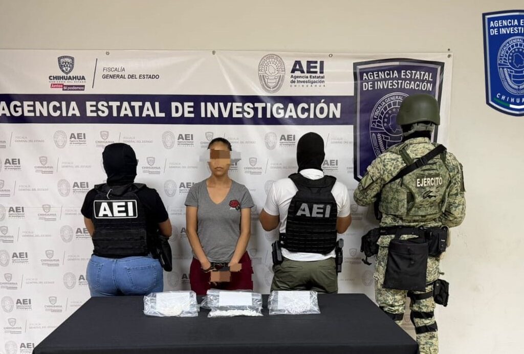Ciudad Juárez, Chih., a 09 de octubre de 2025.- Elementos de la Agencia Estatal de Investigación, adscritos a la Fiscalía de Distrito Zona Norte, en colaboración con el Ejército Mexicano, detuvieron a quien se identificó como Karen Magdalena B. B., por delitos contra la salud, al encontrarse en posesión de mil 62 dosis de cocaína, en hechos registrados en la…