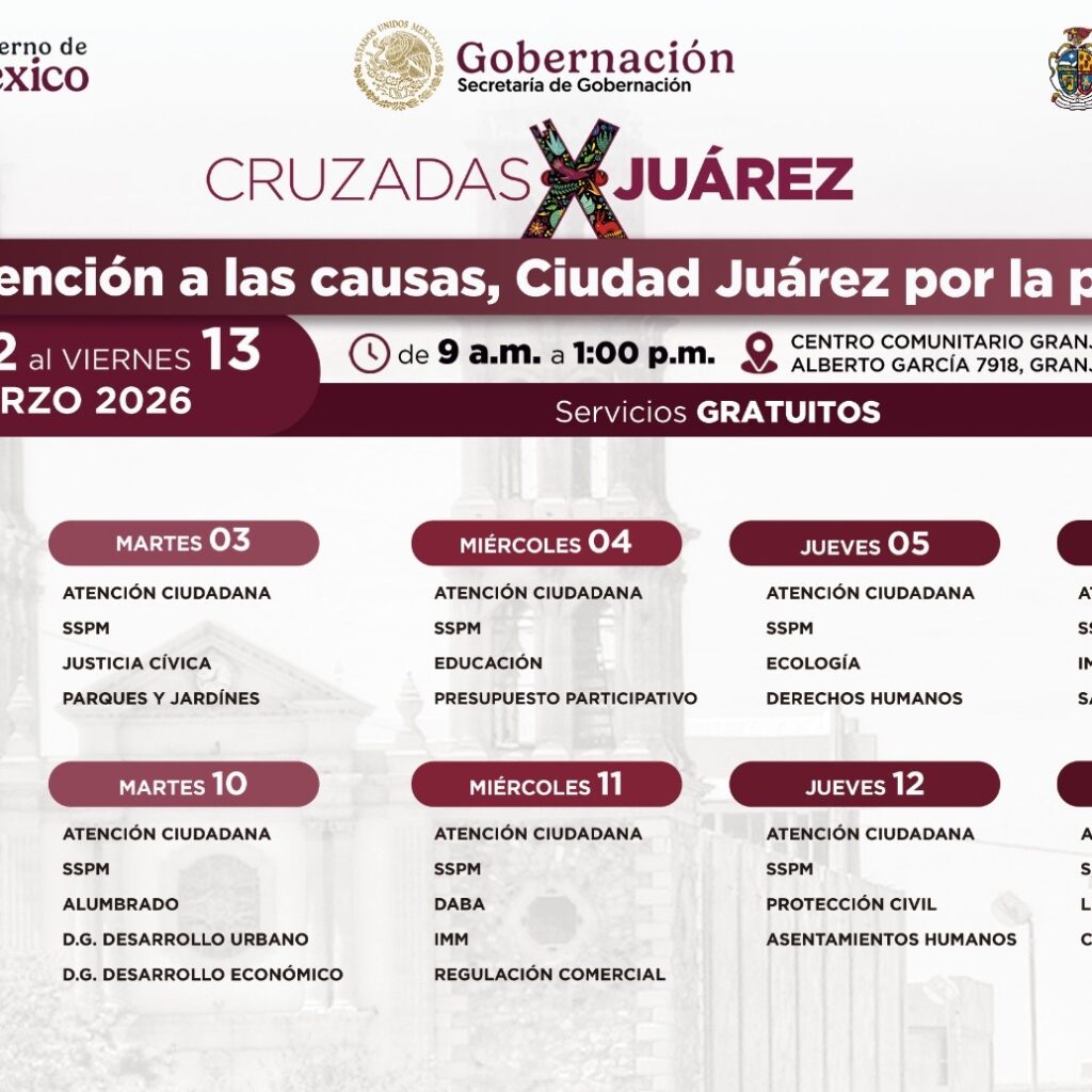 Martes 3 de Marzo del 2026.- El próximo sábado 14 de marzo se llevará a cabo el programa Cruzadas por Juárez, Atención a las Causas, Ciudad Juárez por la Paz en la colonia Revolución Mexicana, en la calle General Julio Acosta y calle General Calixto Contreras de 9:30 de la mañana a 1:30 de la tarde. La titular de la…